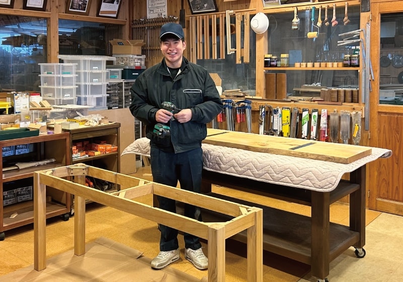 令和3年に行われた東京技能五輪全国大会で銅賞を獲得した私の三男(土岐直史・25歳)が、北海道旭川市で4年間の修行を終え帰郷しました。また、私がお世話になった愛媛県宇和島高等技術専門校から訓練生の紹介をお願いするなどさらに手加工作業ができる若手家具職人の育成を強化して参ります。