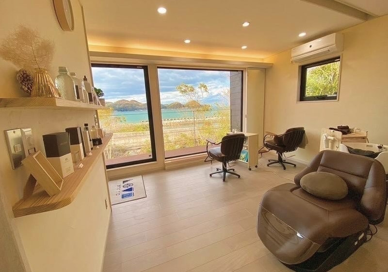 「未来に残す、美しい髪と身体と地球環境」をテーマに人と地球に優しい商材を使用しています。また、私が思う地球環境を守る方法として、“人の心を満たすこと”がとても重要なことだと考えています。2階の美容室からは、目の前に海が広がり、動物や植物、新居大島が見渡せます。美容サロンではありますが、お客様にとっての別荘のような空間作り、施術を心掛けています。