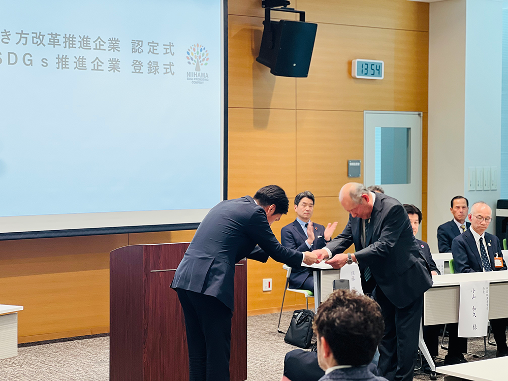 令和7年3月11日(火)、新居浜市働き方改革推進企業認定式及び新居浜市SDGs推進企業登録式が、新居浜市消防防災合同庁舎5階の災害対策室において行われました。新居浜市働き方改革推進企業として新たに1社が認定、新居浜市SDGs推進企業として新たに5社が登録されました。当日は、市長より認定証及び登録証が手渡されました。