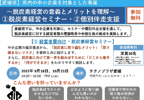 SDGsとは SDGs推進企業とは SDGsとは SDGsとは、国際連合で採択された国際社会が2030年までに持続可能な社会を実現するための17の開発目標(Sustinable Development Goals)をいいます。 SDGs推進企業とは SDGsの達成に向けて、「環境」、「社会」、「経済」の3つの側面に係る取り組みを意欲的に実施する企業をSDGs推進企業として登録します。 SDGs推進企業登録制度について SDGs推進企業登録企業紹介 SDGs推進企業登録一覧を見る▶ セミナー&イベント情報 四国地域の中堅・中小企業向けオンラインセミナー詳しくはこちら サイトはこちら 事業会社、スタートアップ等向け新規事業開発勉強会について詳しくはこちら サイトはこちら 【愛媛県主催】「脱炭素経営セミナー・個別伴走支援」のご案内詳しくはこちら サイトはこちら 高度外国人材活用セミナーin四国詳しくはこちら サイトはこちら 「新居浜市中小企業DX化促進伴走支援事業」のご案内 サイトはこちら 3月26日、中堅・中小企業向け合同施策説明会を開催します。詳しくはこちら サイトはこちら 3月6日「新居浜市DX推進ラボフォーラム」を開催します。詳しくはこちら サイトはこちら 仕事と家庭の両立の取組を支援する情報サイト「両立支援のひろば」をぜひご覧ください。詳しくはこちら サイトはこちら 経営セミナー「工場を見せることによって得られたもの-ものづくりでつながる地域の力-」を開催します! サイトはこちら 7月25日(木)16:00~オンラインにて経済産業省 四国経済産業局 主催の「四国内企業の事例から学ぶ新たな人材の活用セミナー」が開催されます。詳しくはこちら サイトはこちら 新居浜市の健康アプリ「新居浜KENPOS」はご存じでしょうか?詳しくはこちら サイトはこちら 【愛媛県主催】「経営層対象リスキリング推進セミナー」が7月19日、8月2日に開催! 詳しくはこちら カーボンニュートラル実践セミナー開催。 詳しくはこちら 【今、男性育休を考える セミナー&ワークショップ】セミナー開催します!詳しくはこちら ページのトップへ