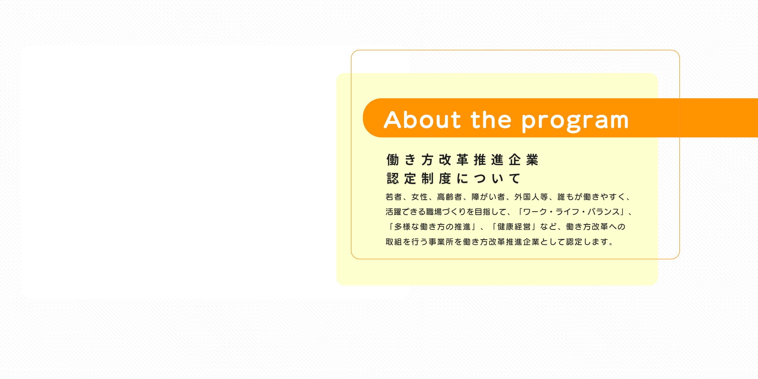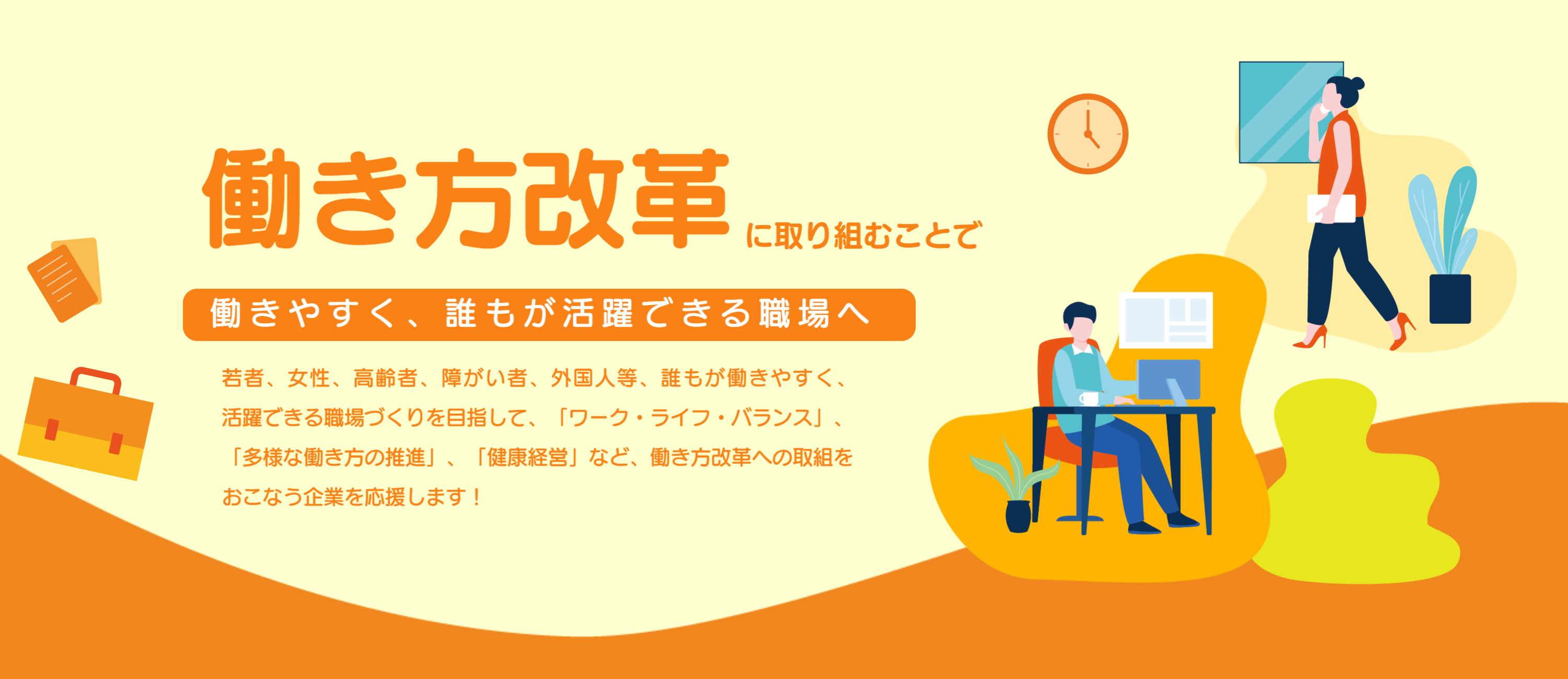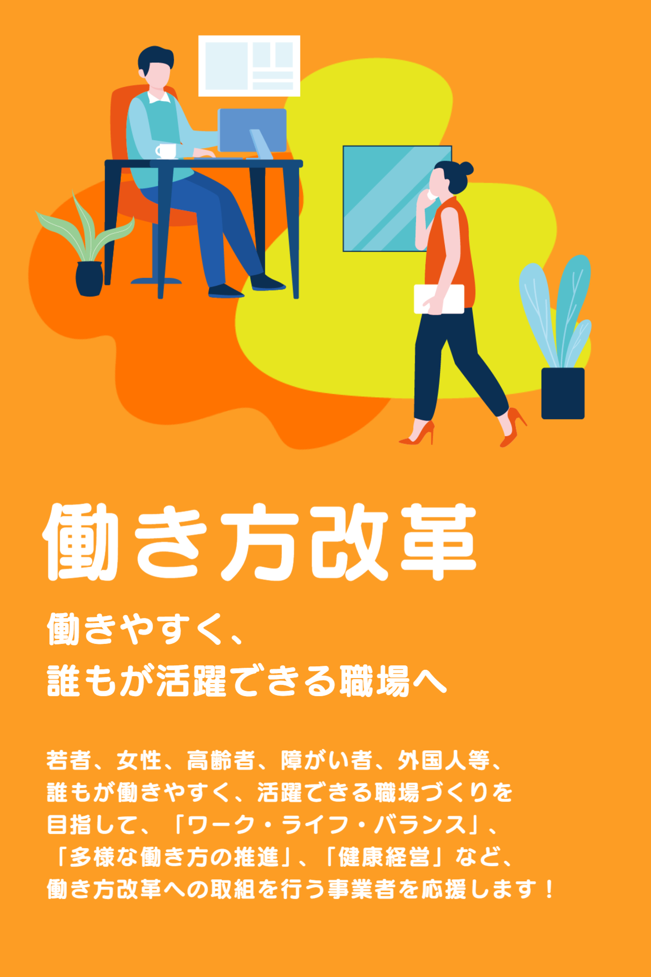 若者、女性、高齢者、障がい者、外国人等、誰もが働きやすく、活躍できる職場づくりを目指して、「ワーク・ライフ・バランス」、「多様な働き方の推進」、「健康経営」など、働き方改革への取組を行う事業所を働き方改革推進企業として認定します。