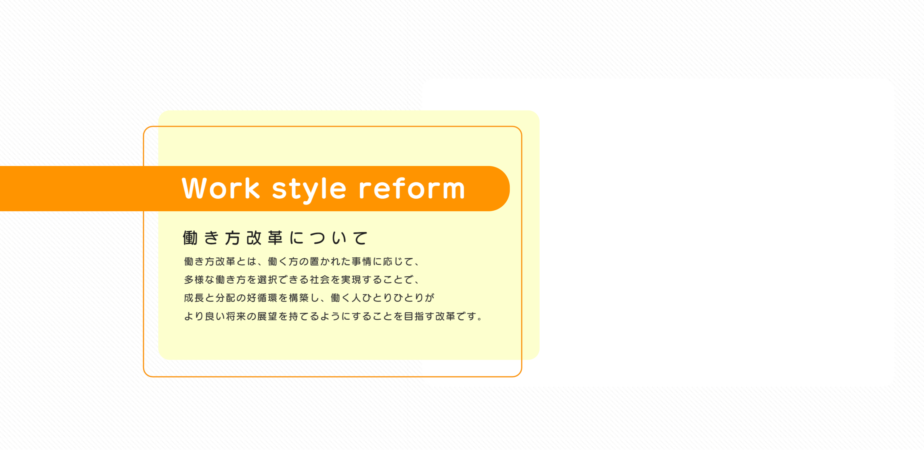 働き方改革とは、働く方の置かれた事情に応じて、多様な働き方を選択できる社会を実現することで、成長と分配の好循環を構築し、働く人一人ひとりがより良い将来の展望を持てるようにすることを目指す改革です。